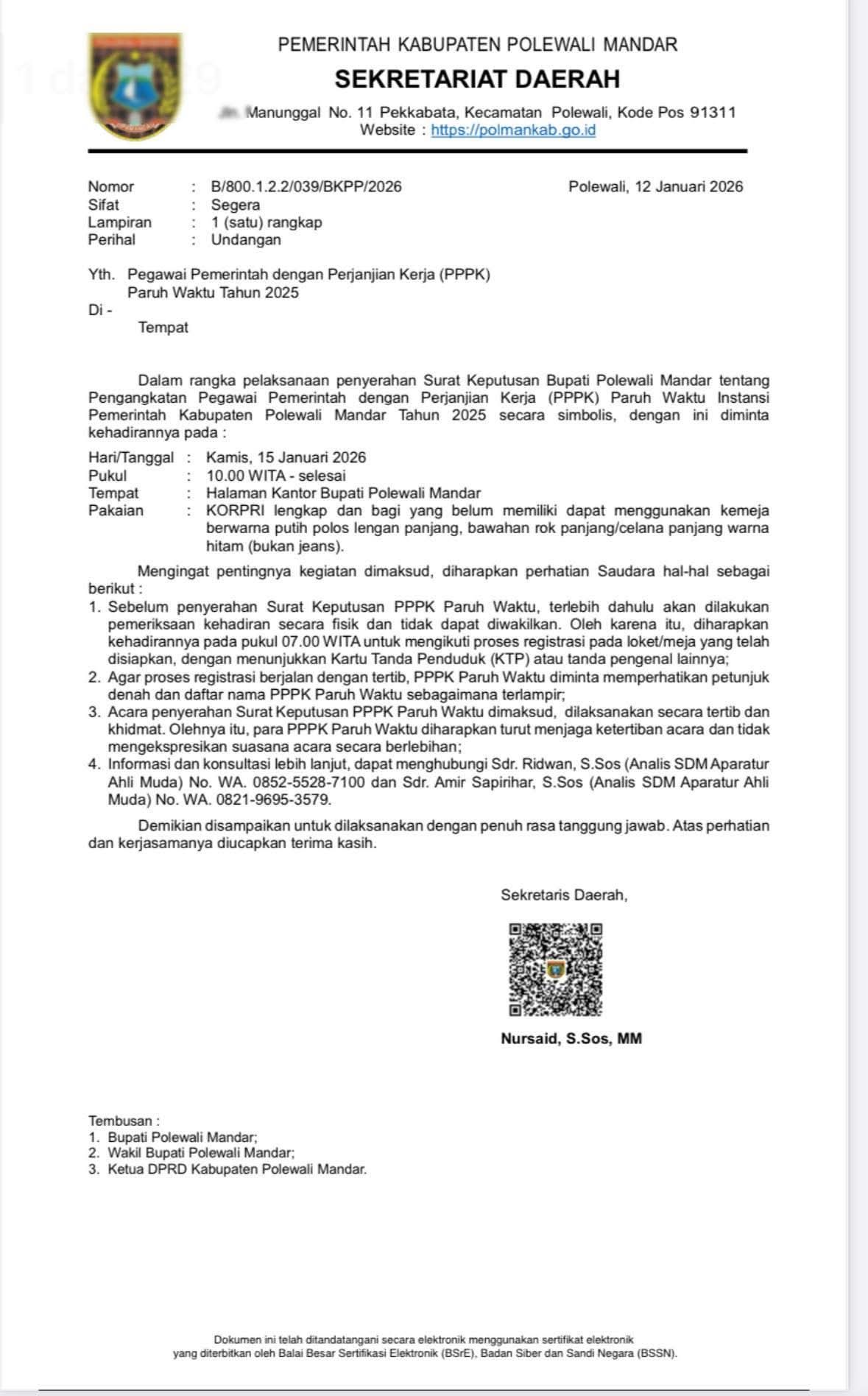 SKOR News, Polewali Mandar - 4232 Pengawai Pemerintah Dengan Perjanjian Kerja, Paruh Waktu (PPPK-PW) pengangkatan Tahun, 2025. Akan menerima SK, pada Tanggal, 15 Januari 2026.