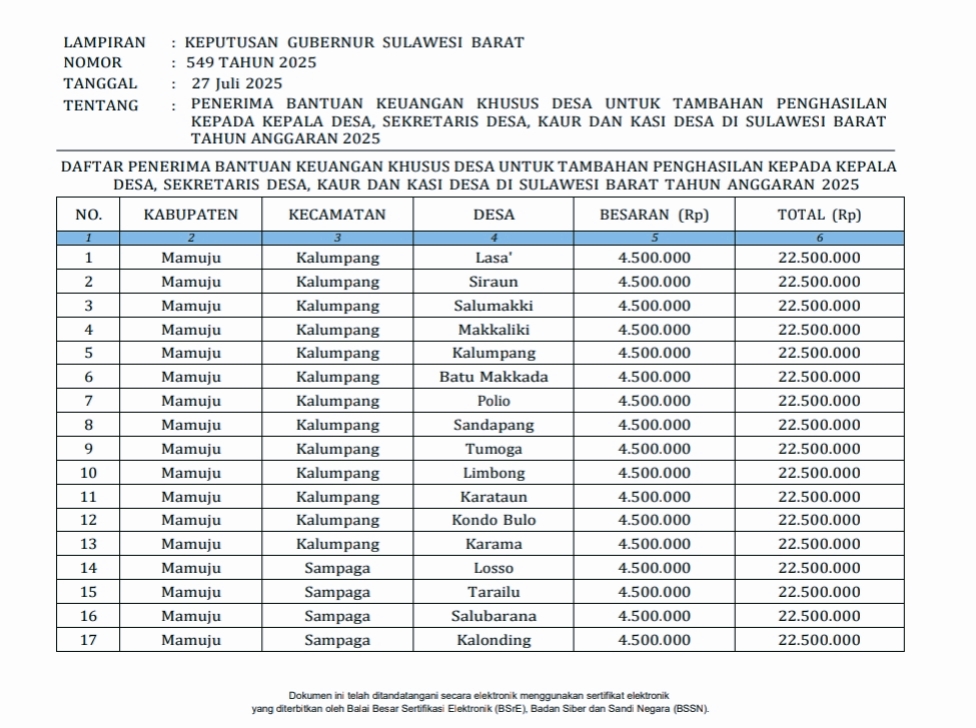 SKOR News, Sulawesi Barat - Penyaluran Bantuan Keuangan Khusus (BKK Desa) Tahun, 2025 Pemprov. Sulawesi Barat tidak diterima seluruhnya oleh Perangkat Desa. Setiap Bulan, Perangkat Desa seharusnya menerima Rp 4,5 Juta/Bulan selama Lima Bulan, dengan total Rp 22,5 Juta/Desa, sesuai SK Gubernur Sulawesi Barat, No. 549/2025 tentang BKK Desa.