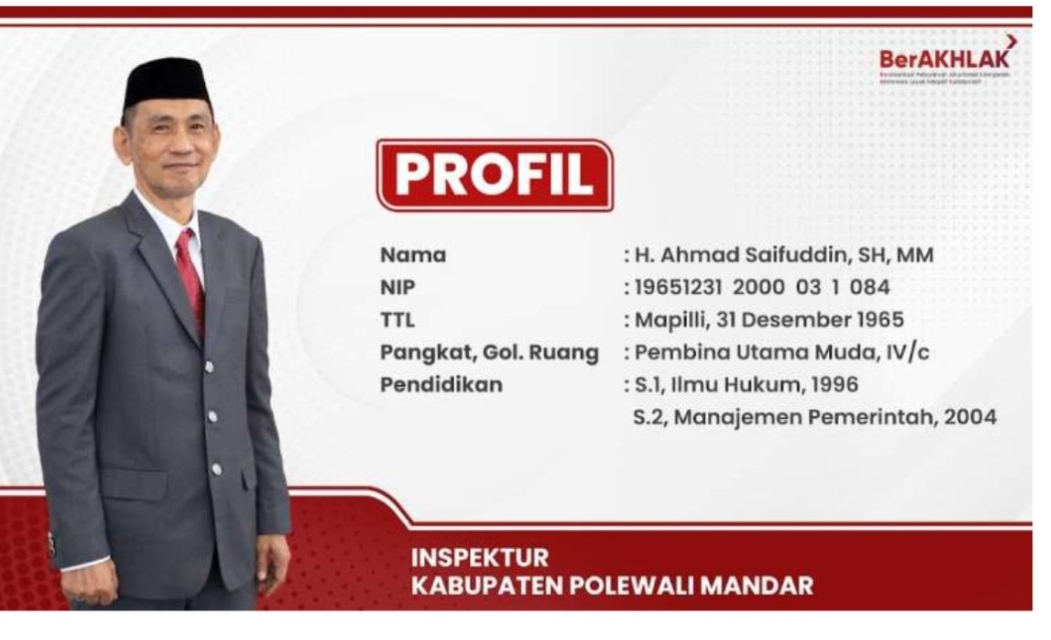 Pj. Sekretaris Daerah, Ahmad Syaifuddin saat ini juga menjabat Inspektur Kab. Polewali Mandar. Pengalaman, prestasi dan integritasnya sebagai Birokrat tidak lagi diragukan. Sejumlah temuan pelanggaran dan Miliaran kerugian daerah berhasil dipulihkan dan dikembalikan ke Kas Daerah, selama dirinya menjabat Kepala Inspektorat. *Awi
