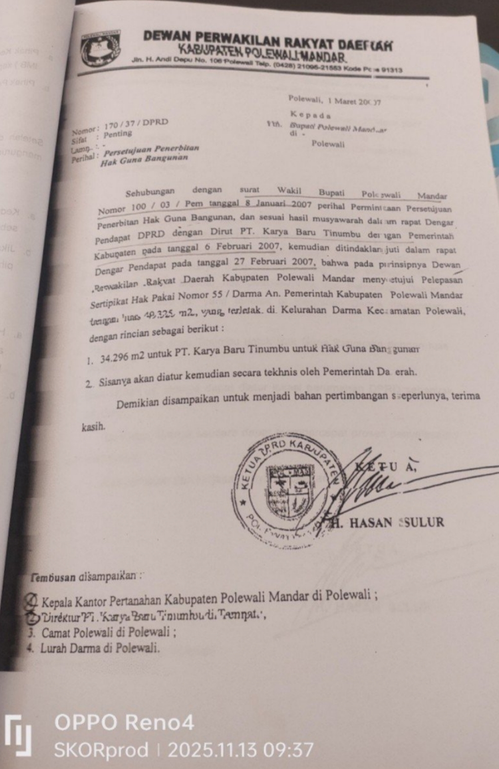 Surat Persetujuan DPRD tersebut, yang kemudian menjadi dasar dilakukan Perjanjian Bersama antara Bupati Polman dengan Diretur PT Karya Baru Tinumbu. Tanggal, 3 April 2007. Juga, menjadi dasar pertimbangan terbitnya Surat Keputusan Bupati, No. 142 pada Tanggal, 18 April 2008. Tentang, Pemebebasan HGB kepada PT Karya Baru Tinumbu.