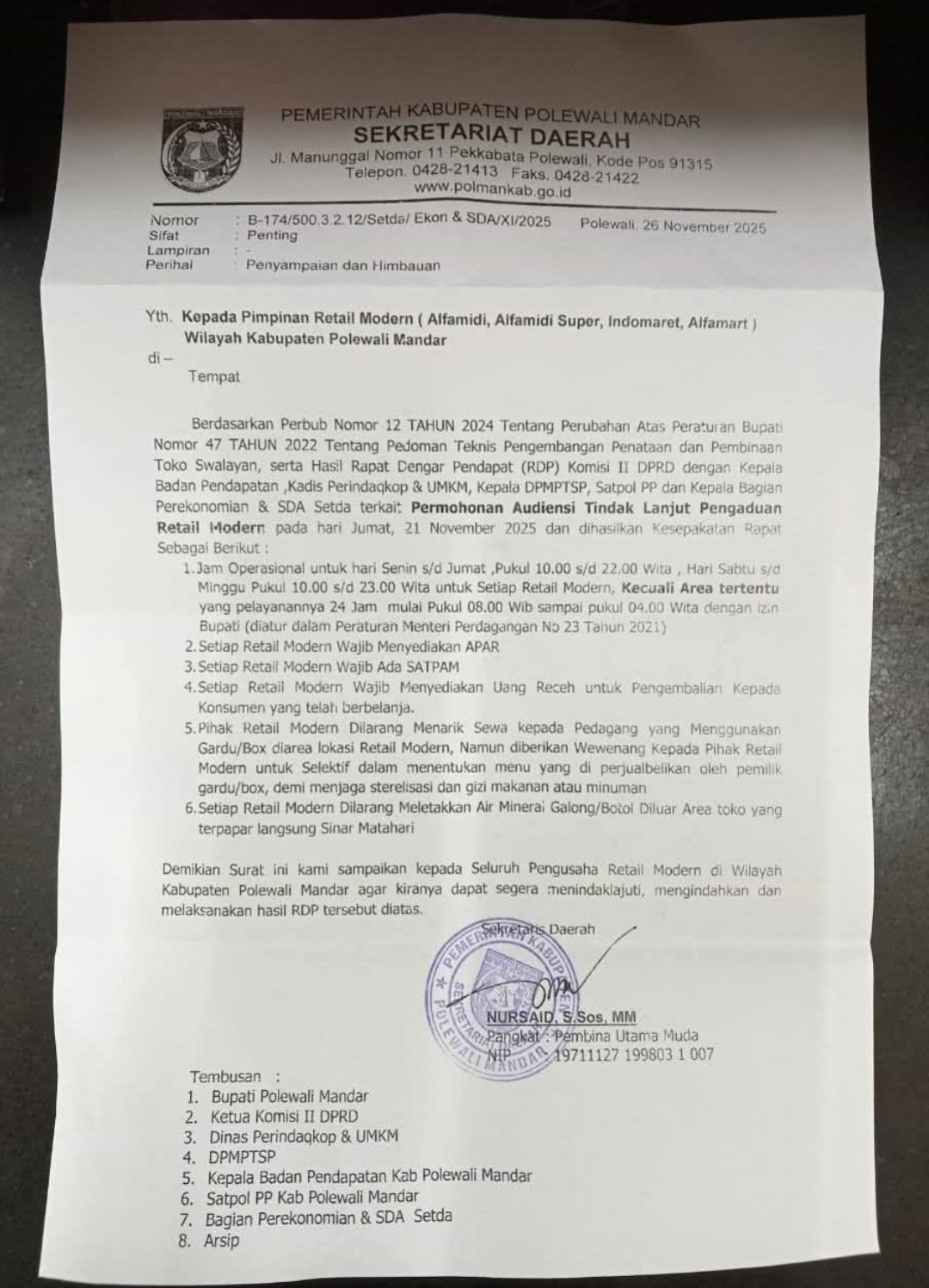 Diketahui, kebijakan pembatasan jam operasional Minimarket, suratnya diteken Sekretaris Daerah, Nursaid tanpa melibatkan Bagian Hukum dan OPD Teknis terkait, yakni Dinas Perindagkop & UKM, Kab. Polewali Mandar.