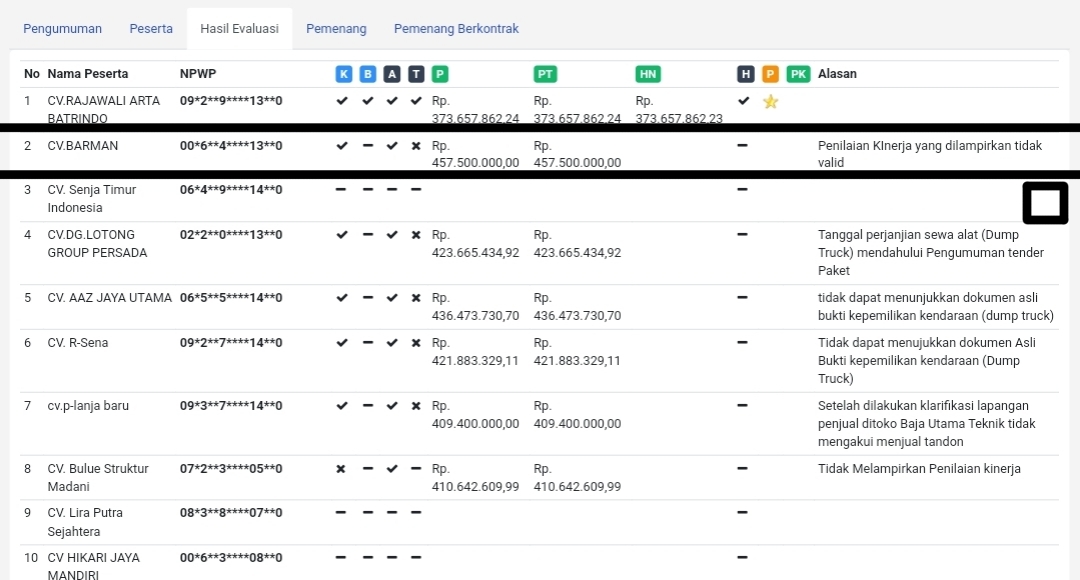 Dugaan "persekongkolan" Pokja dan CV Barman hingga menang tender. Karena, pada tender Puskesmas yang diikuti CV Barman, digugurkan Pokja. Karena, penilaian kinerjanya tidak valid. Anehnya, gugur di Proyek Puskesmas justru menang pada proyek RSUD.
