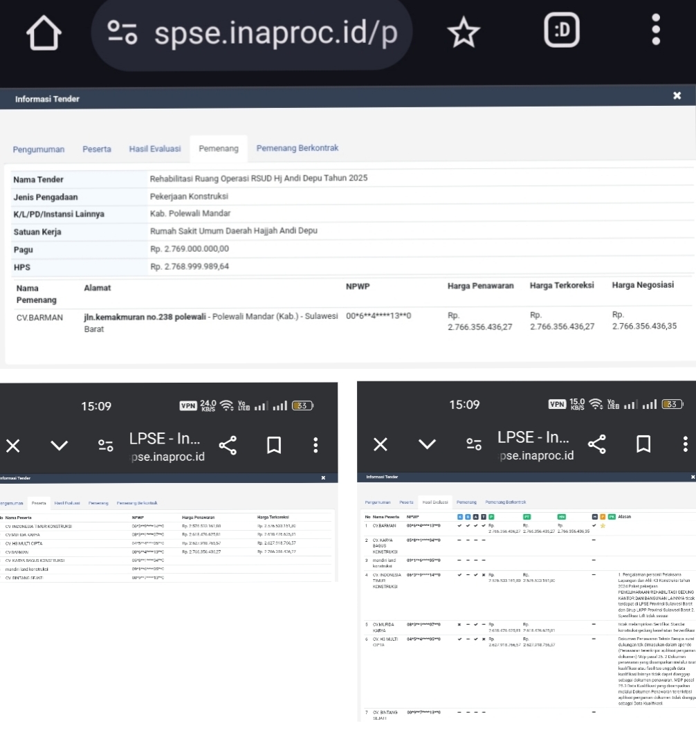 SKOR News, Polewali Mandar - CV Barman, Perusahaan pemenang tender Rehabilitasi Ruang Operasi RSUD Hj. Andi Depu di LPSE Kab. Polewali Mandar. Diduga, "bersekongkol" dengan Pokja ULP untuk memenangkan tender. Lalu, CV Barman juga diduga "bersekongkol" dengan PPK untuk megalihkan seluruh pekerjaan kepada kontraktor lain.
