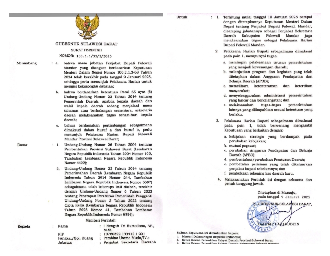 Hal tersebut tertuang dalam Surat Perintah Gubernur Sulawesi Barat yang ditandatangani Pj. Gubernur, Bahtiar Baharuddin. Tertanggal, 9 Januari 2025.