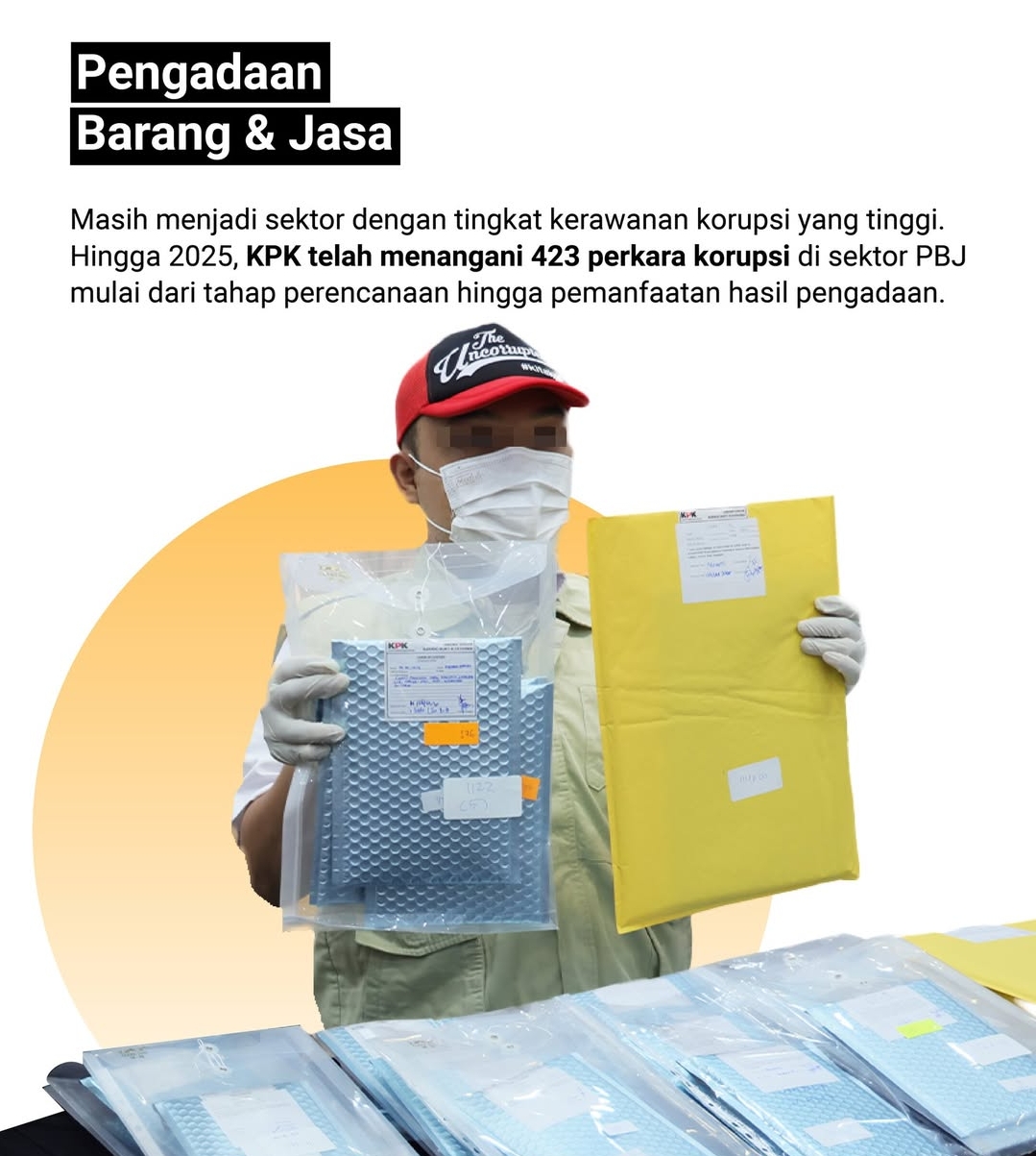 Kasus korupsi terbesar terjadi di sektor pengadaan. Tahun, 2024. KPK telah menangani 423 kasus korupsi sektor pengadaan barang dan jasa dengan modus beragam. Mulai dari mark up harga, hingga pengkondisian pemenang tender.