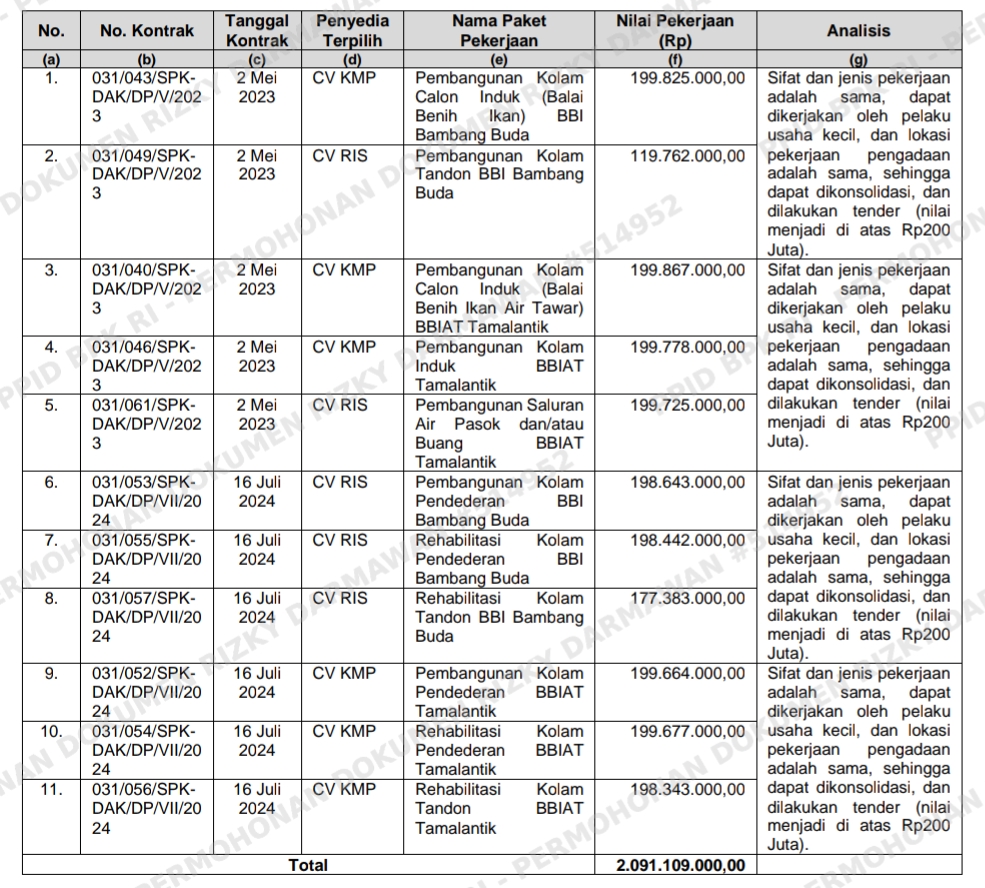 Dalam catatan Auditor, Dinas Perikanan beralasan, sengaja memecah kegiatan menjadi 11 paket pekerjaan (masing-masig paket dipecah dibawah Rp 200 Juta) dari total Rp 2 Miliar itu untuk memberdayakan penyedia lokal melalui PL dengan menunjuk langsung penyedia. Faktanya, hanya Dua penyedia yang ditunjuk melakukan pekerjaan. Yakni, CV "RIS" dan CV "KMP".