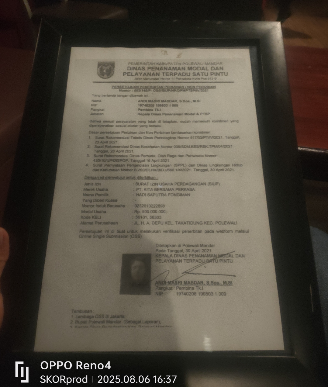 SKOR News, Polman || Sulbar - Gerakan cepat SATPOL PP Kab. Polman merespon isu adanya usaha terselubung BIG Resto&Cafe. Kasatpol PP, Arifin Halim langsung menurunkan penyidiknya, Yusuf dan sejumlah anggota penyidik lainnya (6/7), untuk memeriksa kelengkapan dokumen perizinan pelaku usaha, PT Kita Bersama Perkasa.