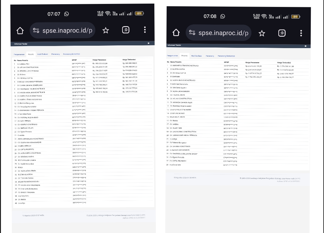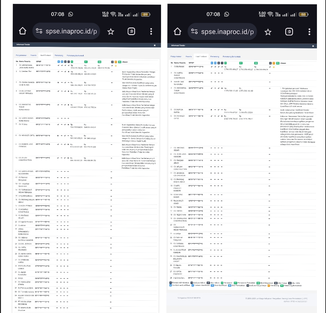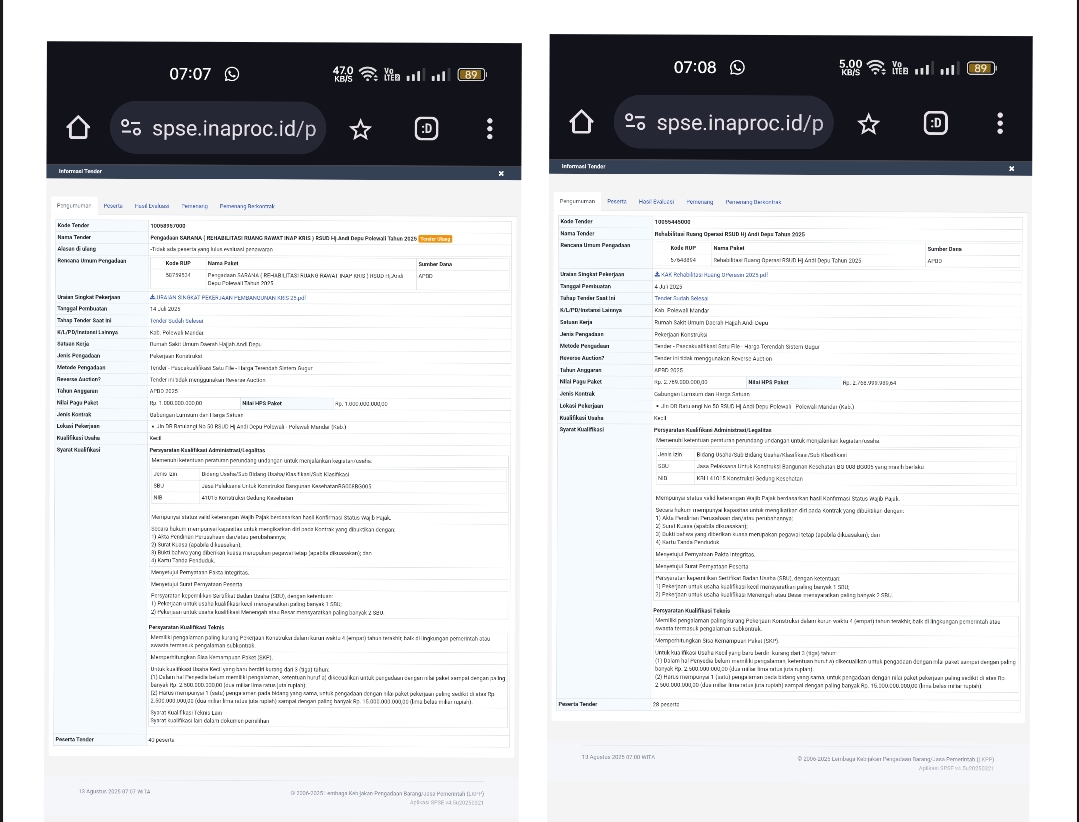 Informasi yang dihimpun skornews, pada tender pekerjaan Rehabilitasi Ruang Rawat Inap KRIS. CV ITK (Peserta penawar No. Urut 8) dengan nilai penawaran Rp 970.042.755 telah melayangkan sanggahan terhadap Pokja ULP. Sementara itu, Peserta dengan penawar terendah (Nomor Urut 1) pada Dua Tender tersebut, diduga tidak memberikan sanggahan dan legowo menerima hasil tender.?????