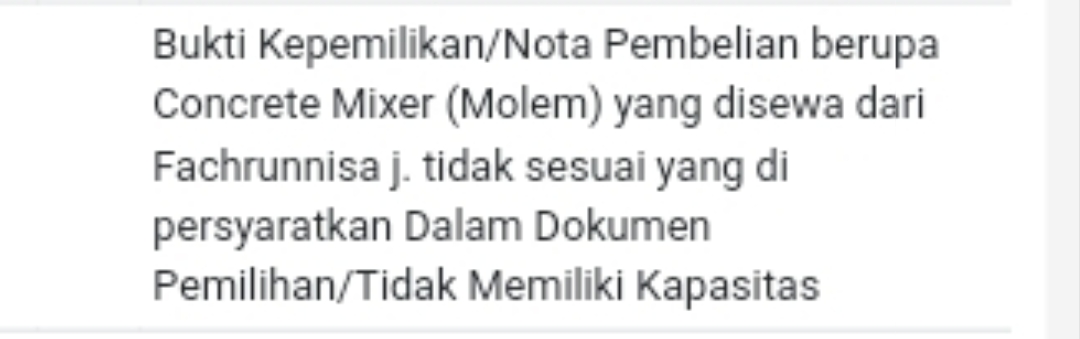 CV Ba. yang ditetapkan sebagai pemenang, menawar dengan harga penawaran Rp 2.766.356.436. Berhasil, menyingkirkan penawar terendah CV ITK dengan nilai penawaran Rp 2.576.533.161. Selisih nilai penawaran cukup signifikan, sebesar Rp 190 Juta.