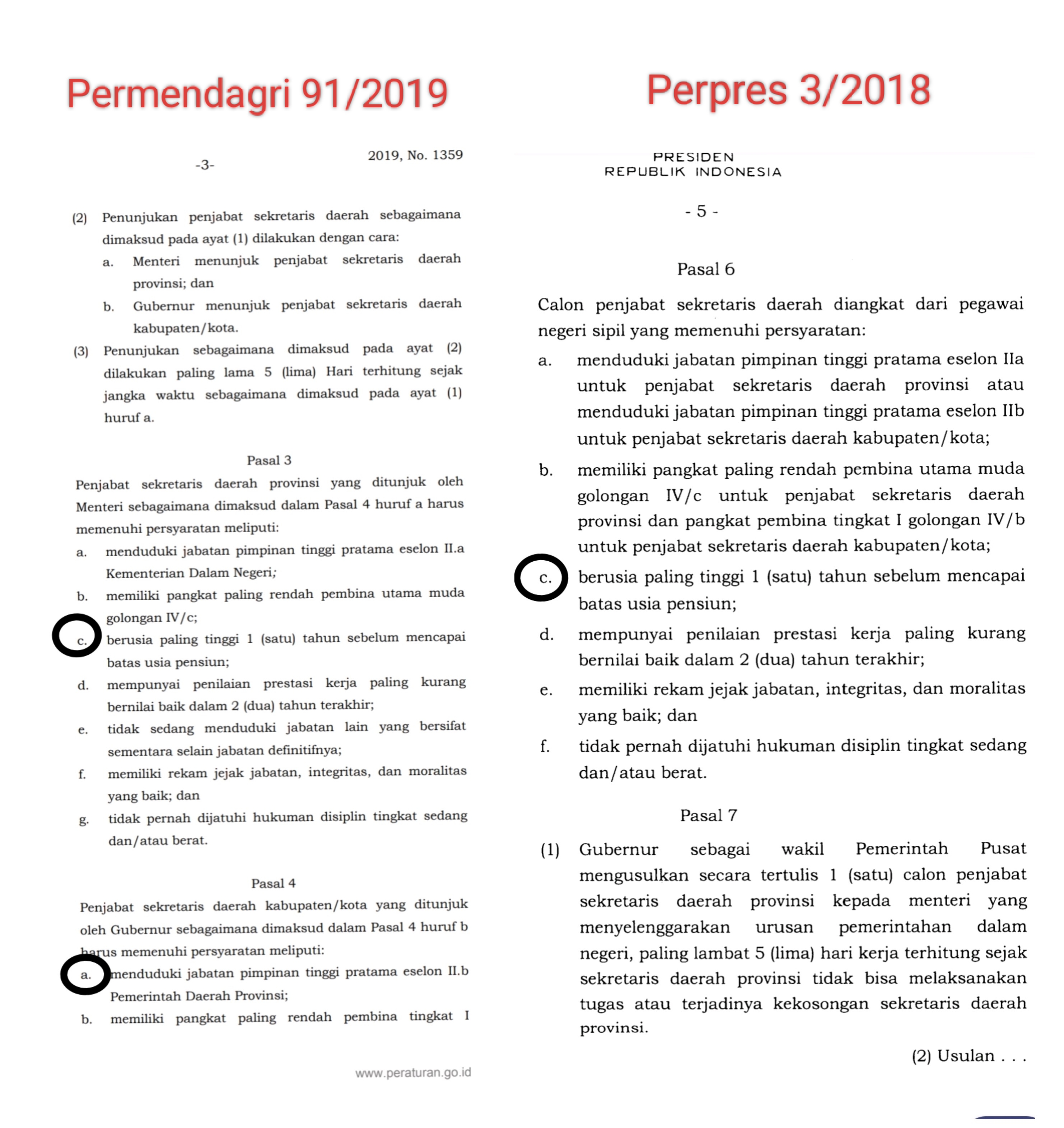 Diketahui, pelantikan Pj. Sekda melanggar Dua pasal sekaligus dalam Pemendagri No. 91 Tahun, 2019 tentang penunjukan Penjabat Sekretaris Daerah. Yakni, Pasal 3 huruf (c) dan Pasal 4 huruf (a). Demikian juga, Pasal 6 huruf (c) Perpres No. 3 Tahun 2018 tentang Penjabat Sekretaris Daerah.